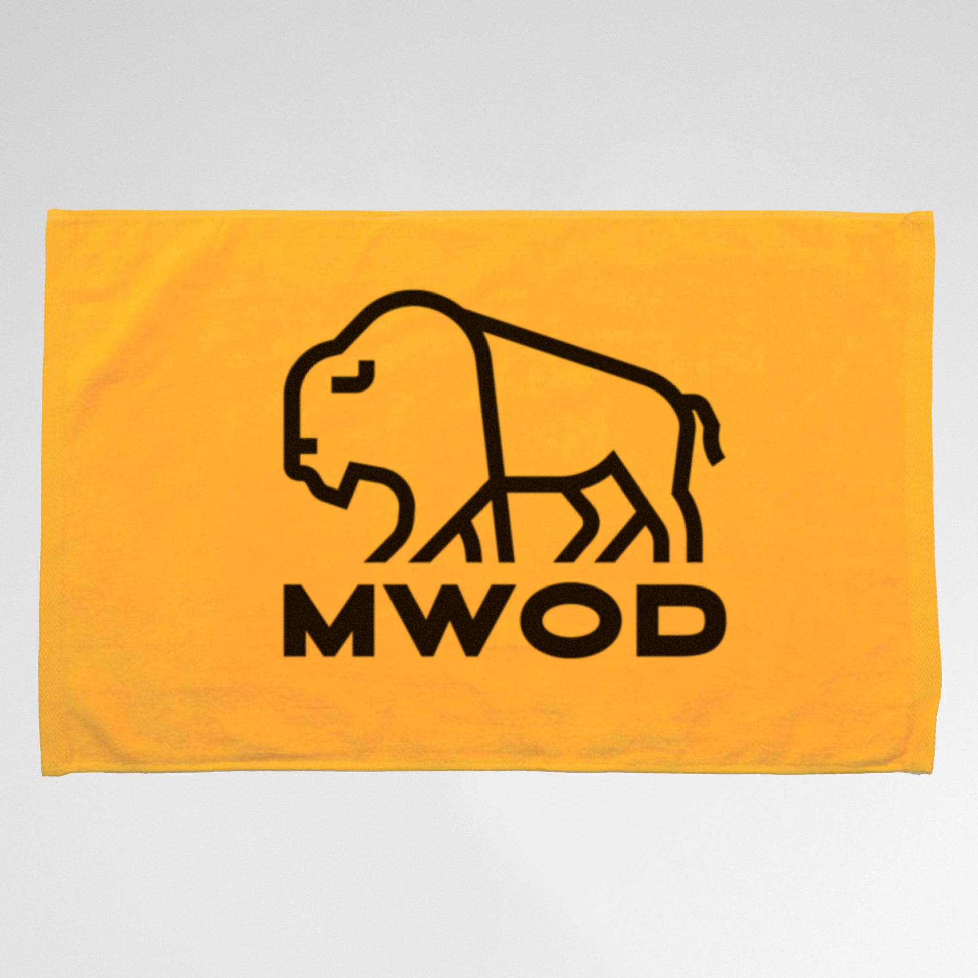 Sweat! 11" x 18", 100% cotton rally towel. Gold with black MWOD logo.